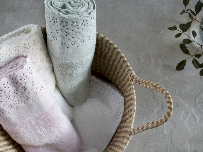 Confeccionado em felpa 100% Algodão Fio Penteado – corpo liso, porém volumoso e extremamente macio, com aplicação de renda bordada em tecido veludo na barra. Apresentam elegância e feminilidade. Acabamento especial que proporciona alta capacidade de absorção, garantindo maciez, toque delicado, volume acentuado, além de brilho natural que realça as cores.